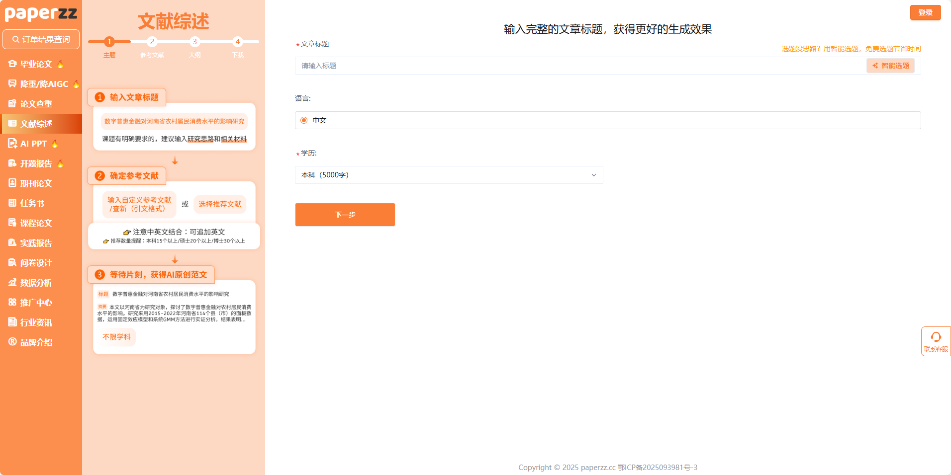 打开 paperzz 平台的文献综述功能页面,你会发现它的操作流程简洁清晰,完全贴合本科生的使用习惯。从输入文章标题到生成 AI 原创范文,仅需三步就能完成,每一步都经过了精心设计,力求让复杂的文献综述写作变得简单高效。
