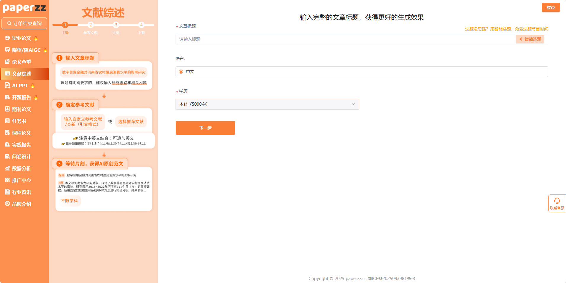 - 没思路?点 “智能选题”,输入你的核心方向(比如 “数字普惠金融 + 农村消费”),系统会推荐 “有聚焦性的综述标题”(比如 “数字普惠金融对农村消费的影响研究综述 —— 基于 2015-2025 年核心文献”),直接帮你把 “时间范围、研究对象” 嵌进标题里;