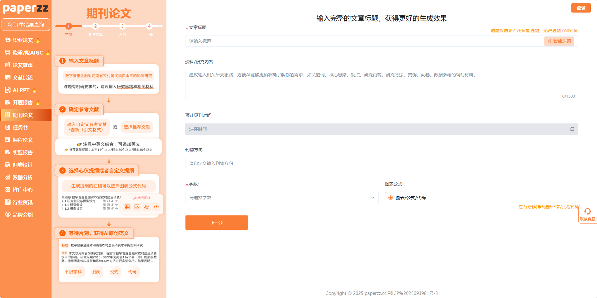 针对上述痛点,paperzz 平台的期刊论文智能生成功能凭借其智能化、专业化的设计,为科研人员提供了从选题到投稿的全流程解决方案。以下是对该功能的详细拆解: