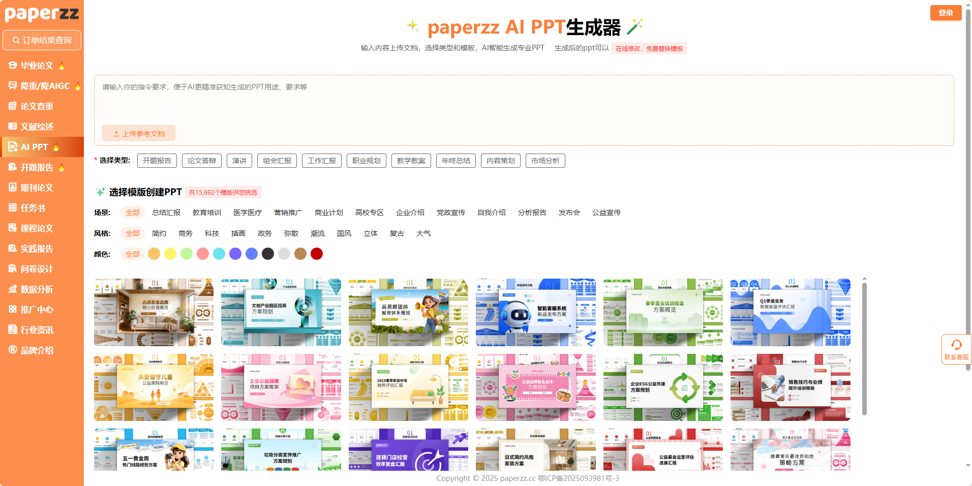 紧接着是类型与模板选择,这是 Paperzz 贴合答辩场景的核心设计。在输入框下方,你可以直接选中「论文答辩」类型,AI 会自动匹配高校答辩 PPT 的标准结构,从封面、目录到致谢页,每一页都符合学术答辩的规范要求,不用再费心搭建框架。下方的模板区提供了 15692 + 款模板,还能按照场景、风格、颜色三个维度筛选:场景上选「高校专区」「总结汇报」,精准适配学术答辩;风格上选「简约」「商务」「科技」,理工科可以选科技风突出数据图表,文科可以选简约风强化文字逻辑;颜色上有 12 种基础色可选,从沉稳的蓝色到清新的绿色,满足不同的审美需求。界面上的模板预览清晰直观,点击就能选中,完全不用担心模板和需求不符。
