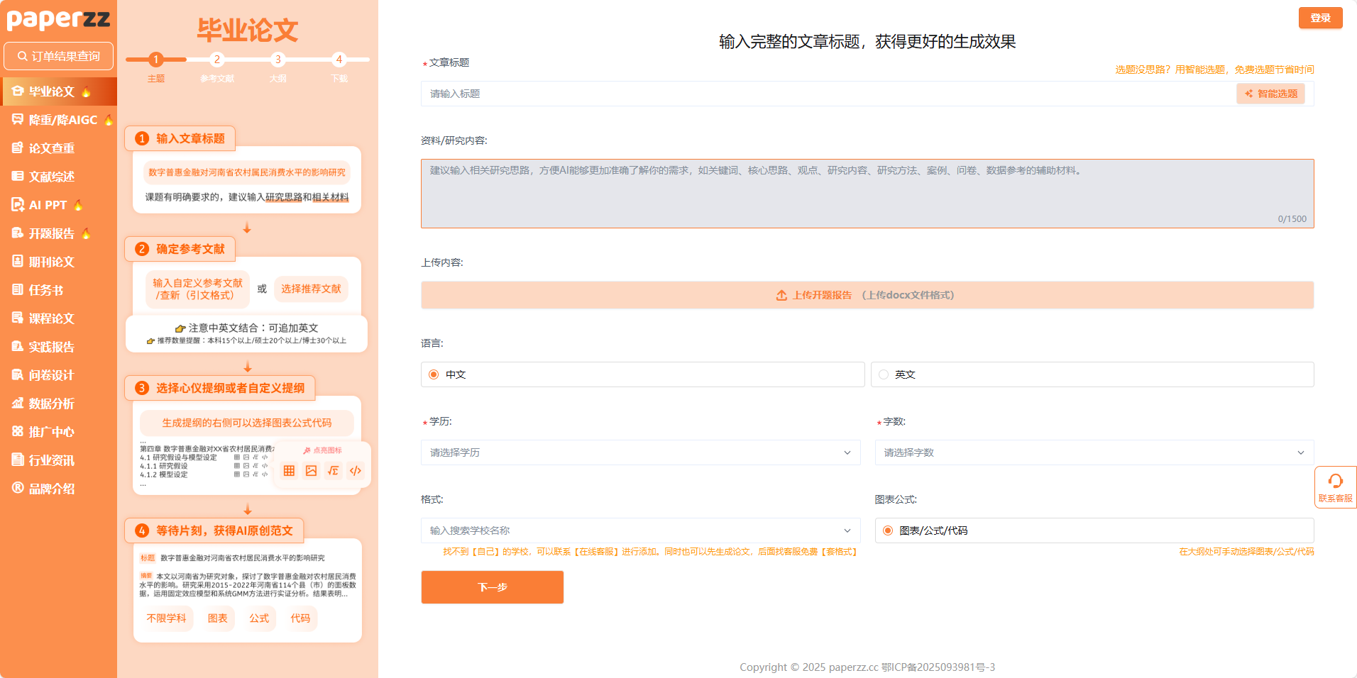 - 输入标题:自带 “智能选题” 功能,没思路直接拿热点方向,连研究背景都帮你写好。