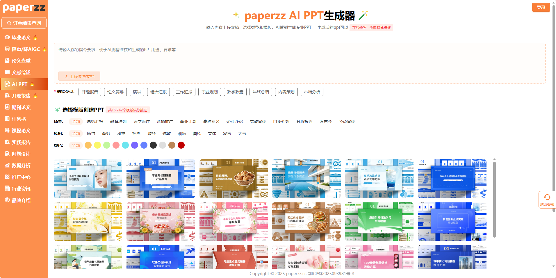 毕业答辩、开题汇报、年终总结、组会汇报…… 每一个需要 PPT 的场景,都成了无数人熬夜赶工的 “噩梦”。对着空白画布发呆 3 小时,找模板、搭框架、填内容、调格式,熬了一整夜做出来的 PPT,要么逻辑混乱、内容单薄,要么风格老气、不符合场景要求,被导师、领导打回重改,白白浪费大量时间。在 AI 工具层出不穷的今天,真正能做到 “输入需求→一键生成→在线修改→免费换模板” 全流程闭环的 PPT 工具少之又少,而 Paperzz 的AI PPT 生成器,以 15742 + 海量模板、全场景类型覆盖、AI 智能生成 + 在线编辑为核心,彻底重构 PPT 制作流程,让从 0 到 1 的 PPT 创作,从几天几夜的煎熬,变成几分钟的轻松输出。