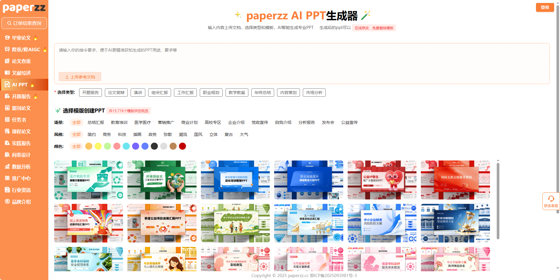 第二步,一键选择适配的场景与模板。系统按用途划分了 10 + 类型,你可以直接选择 “论文答辩” 类型,自动匹配学术场合的规范风格,不用再自己筛选模板;还有开题报告、演讲、组会汇报、工作汇报、教学教案等多种场景,覆盖了学生党从课程汇报到毕业答辩的所有 PPT 需求。平台里共有 15776 个模板可供挑选,场景分类覆盖高校专区、教育培训、医学医疗、营销推广、商业计划等多个领域,还提供简约、商务、科技、插画、国风等多种风格,搭配蓝、橙、绿、紫等 10 + 配色方案,你可以根据自己的专业和答辩氛围,自由选择合适的模板,再也不用在素材网站里大海捞针。