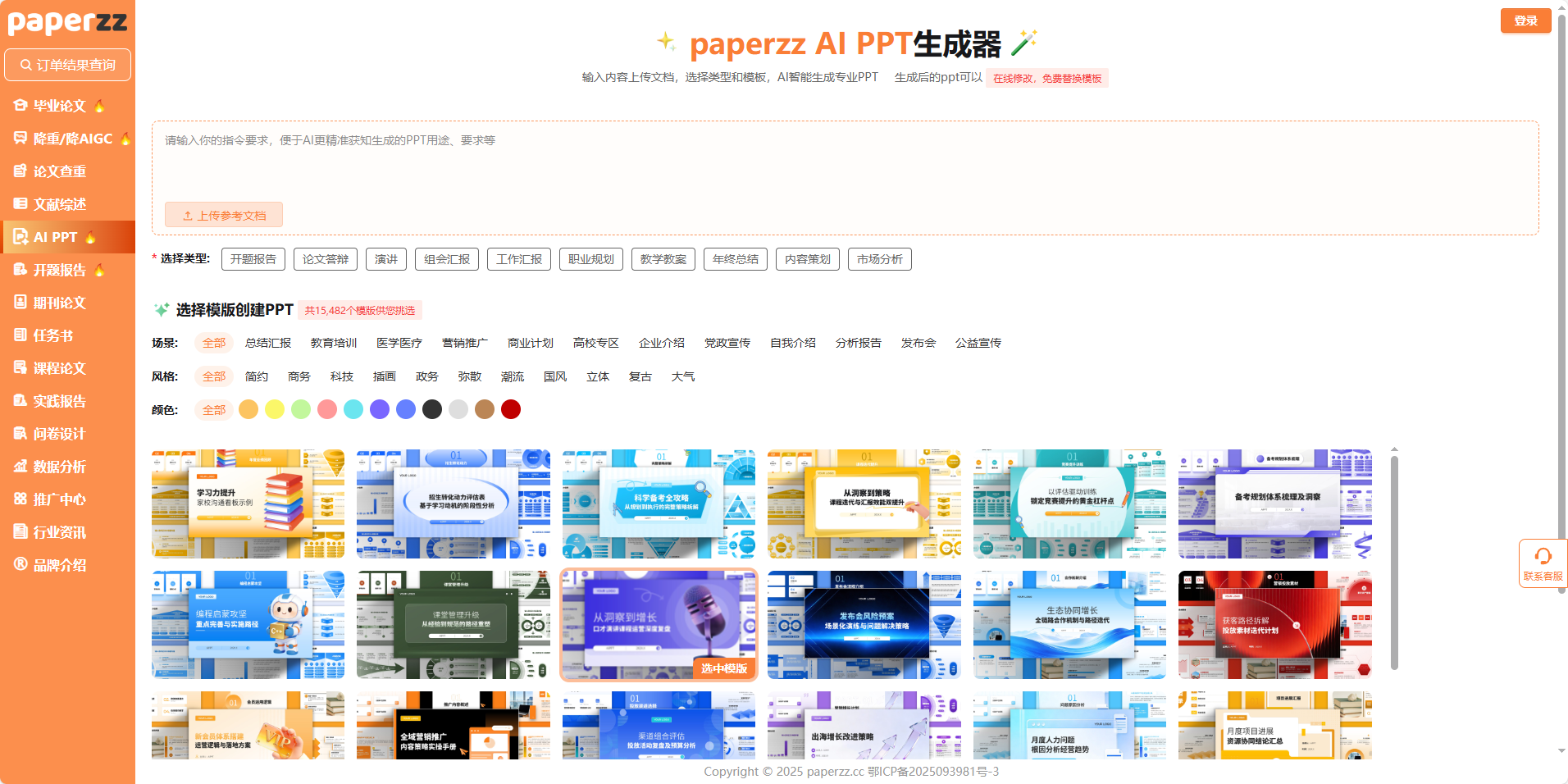 paperzz 的模板库堪称 “演示风格的百宝箱”,拥有 15482 套专业模板,覆盖了开题报告、论文答辩、工作汇报、教学教案等 20 + 种核心场景,以及教育培训、营销推广、医学医疗等 10 + 个行业方向。