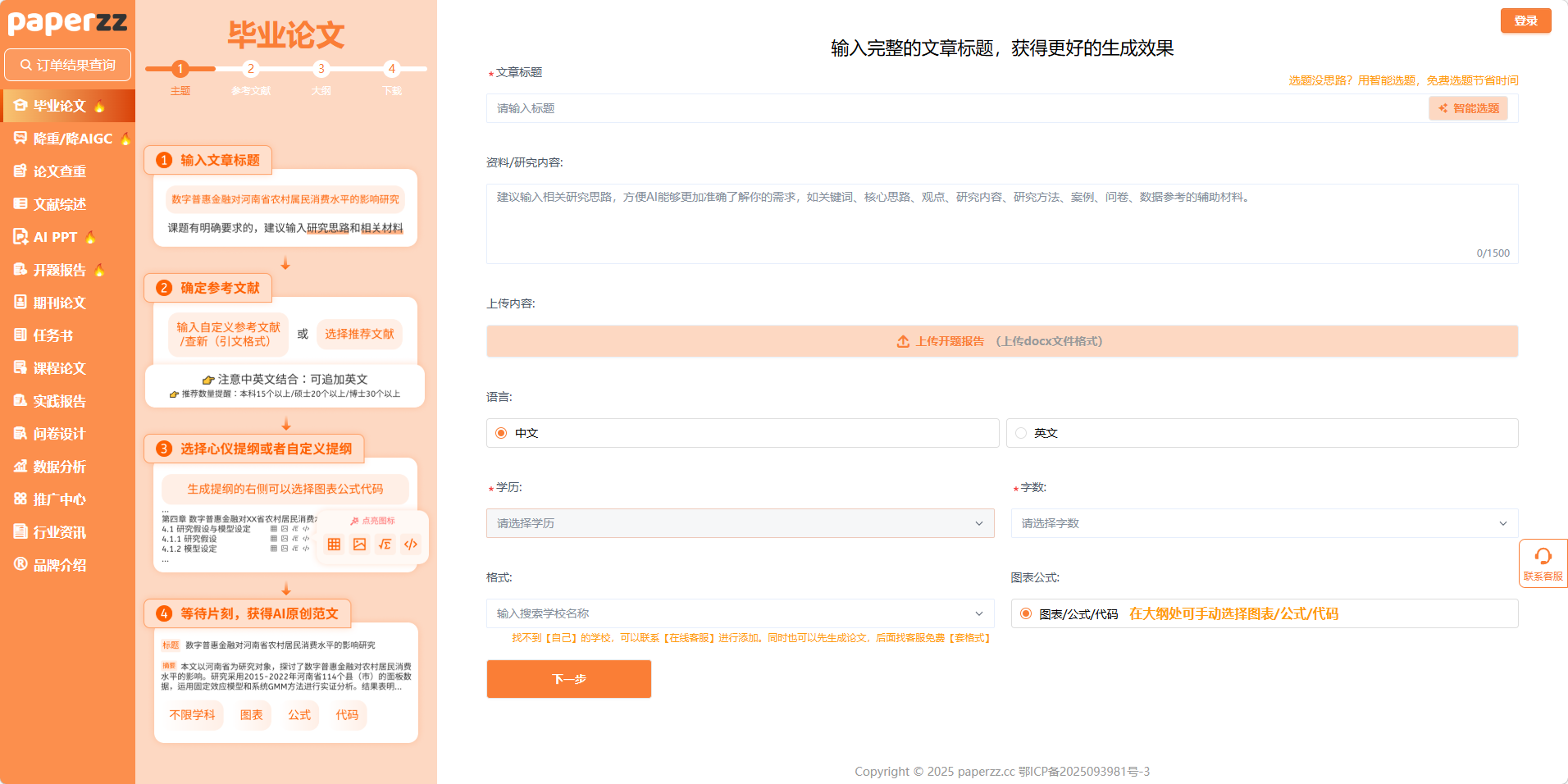 登录 Paperzz 官网,在左侧导航栏点击「毕业论文」,即可进入专属写作页面。不同于市面上 “一键生成” 的粗放型工具,Paperzz 的页面设计完全遵循本科毕业论文的标准写作流程,从主题输入到参考文献、大纲生成,每一个模块都精准对应本科生的真实需求,我们结合页面细节,逐一拆解其核心价值。