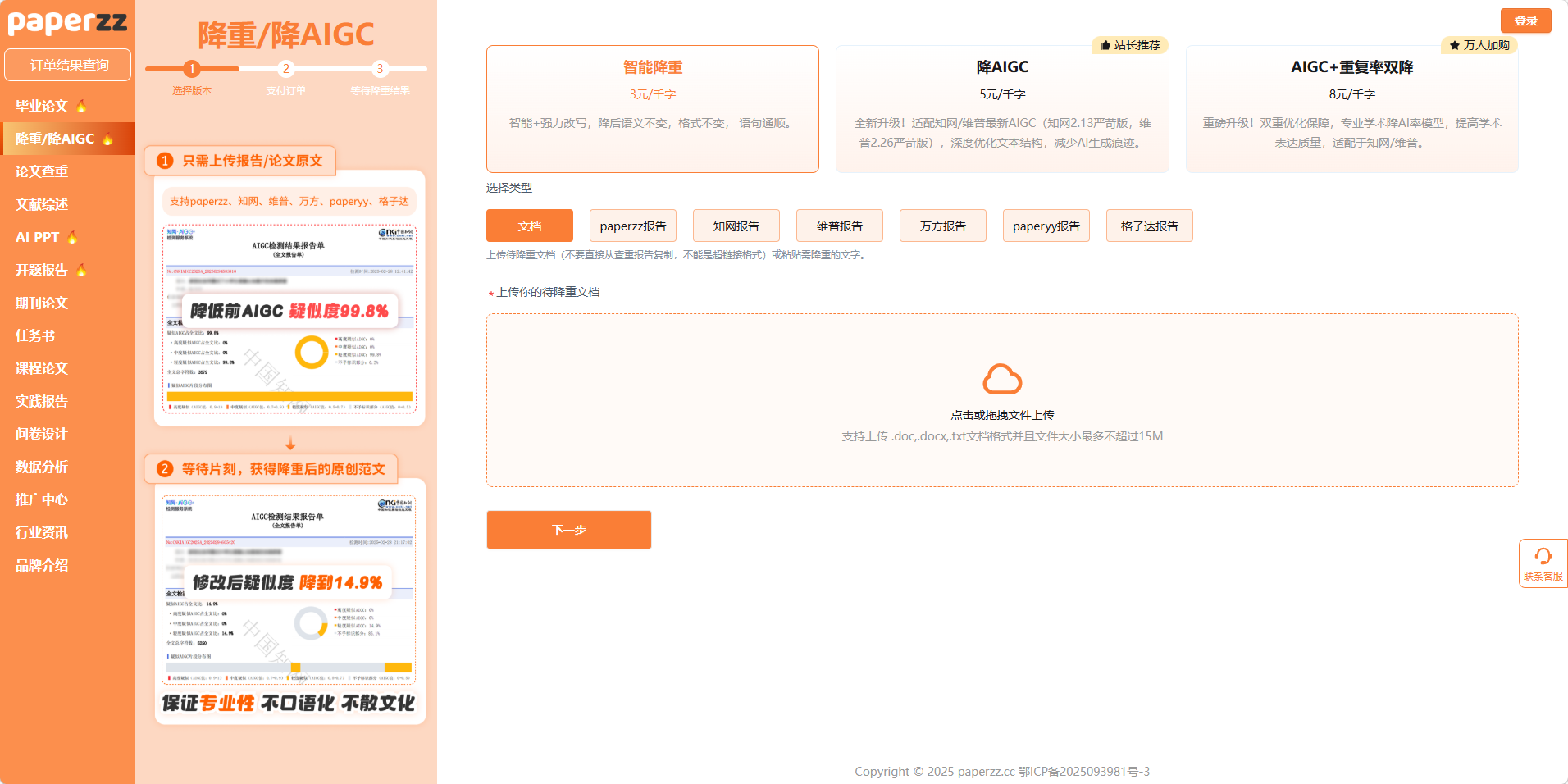 打开 Paperzz 的 “降重 / 降 AIGC” 页面,我们可以清晰地看到平台根据不同需求,提供了 3 种差异化服务,每一种都精准对应了不同的应用场景。