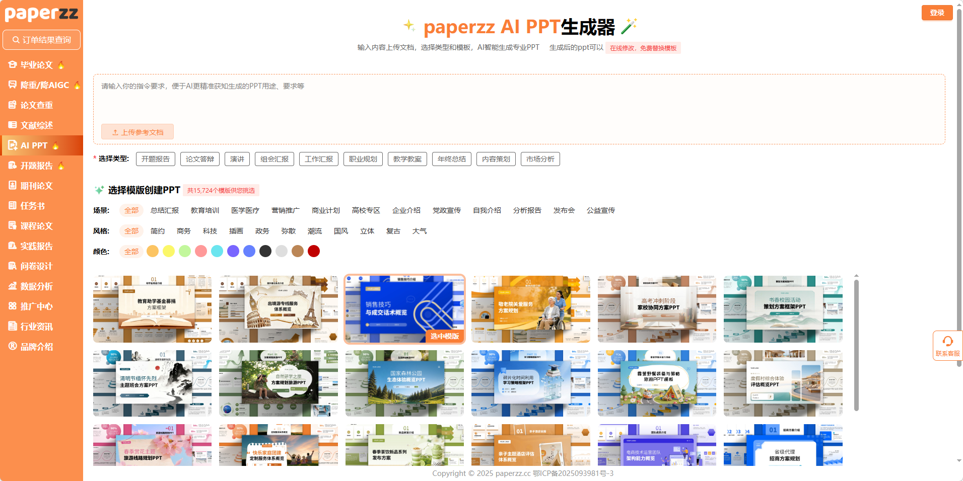 打开 Paperzz 官网的「AI PPT」板块,就能直观看到这套工具的完整逻辑:输入指令 / 上传文档→选择类型与模板→生成并编辑,每一步都精准服务于论文答辩场景。