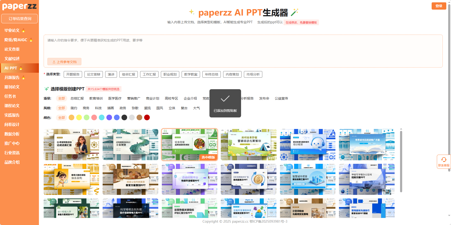 界面核心区域的模板库是 PaperZZ AI PPT 生成器的核心竞争力,界面明确标注 “共 15634 个模板供您挑选”,并通过 “场景、风格、颜色” 三大维度构建了精细化筛选体系,完美适配论文答辩的视觉需求。结合界面元素,模板库的核心优势可分为三点: