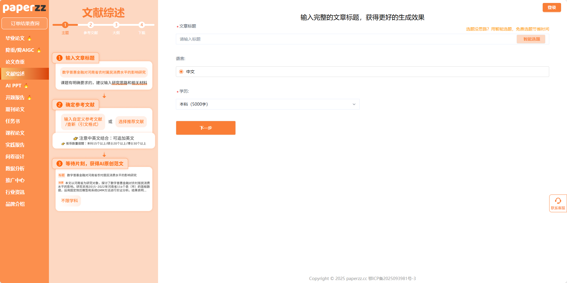 打开 Paperzz 官网的「文献综述」板块,清晰的功能布局和人性化操作逻辑,每一处设计都直击学生写作痛点。页面左侧以「主题→参考文献→大纲→下载」四步流程为核心,全程可视化引导,新手也能零门槛上手:第一步输入文章标题,页面标注 “课题有明确要求的,建议输入研究思路和相关材料”,以 “数字普惠金融对河南省农村居民消费水平的影响研究” 为示例,直观展示填写规范;第二步确定参考文献,提供自定义输入和 AI 推荐两种方式,同时提醒中英文结合,明确本科 15 个以上、硕士 20 个以上、博士 30 个以上的文献数量要求,贴合不同学历的学术规范;第三步等待片刻,即可获得 AI 原创范文,页面标注 “不限学科”,覆盖所有专业的写作需求。右侧主操作区则对应核心配置,包含文章标题、语言选择、学历选择三大模块,搭配「智能选题」按钮,解决选题无思路的痛点,输入完整标题、选择语言与学历(默认本科 5000 字),点击下一步即可推进流程,操作简单高效。