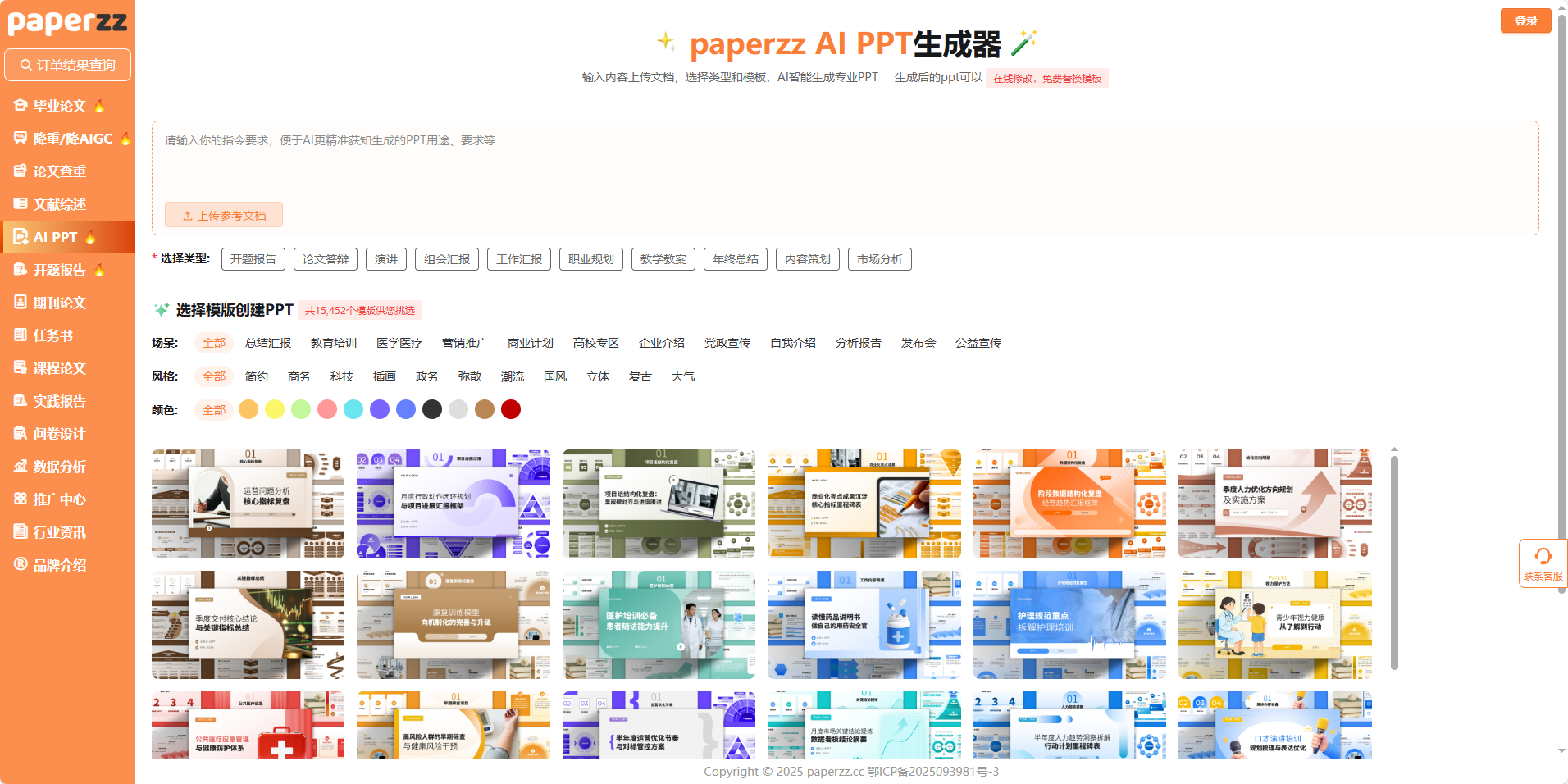 paperzzAIPPT 最亮眼的是 “15452 个模板的精准筛选”—— 通过 “场景、风格、颜色” 三个维度,直接匹配你的使用场景: