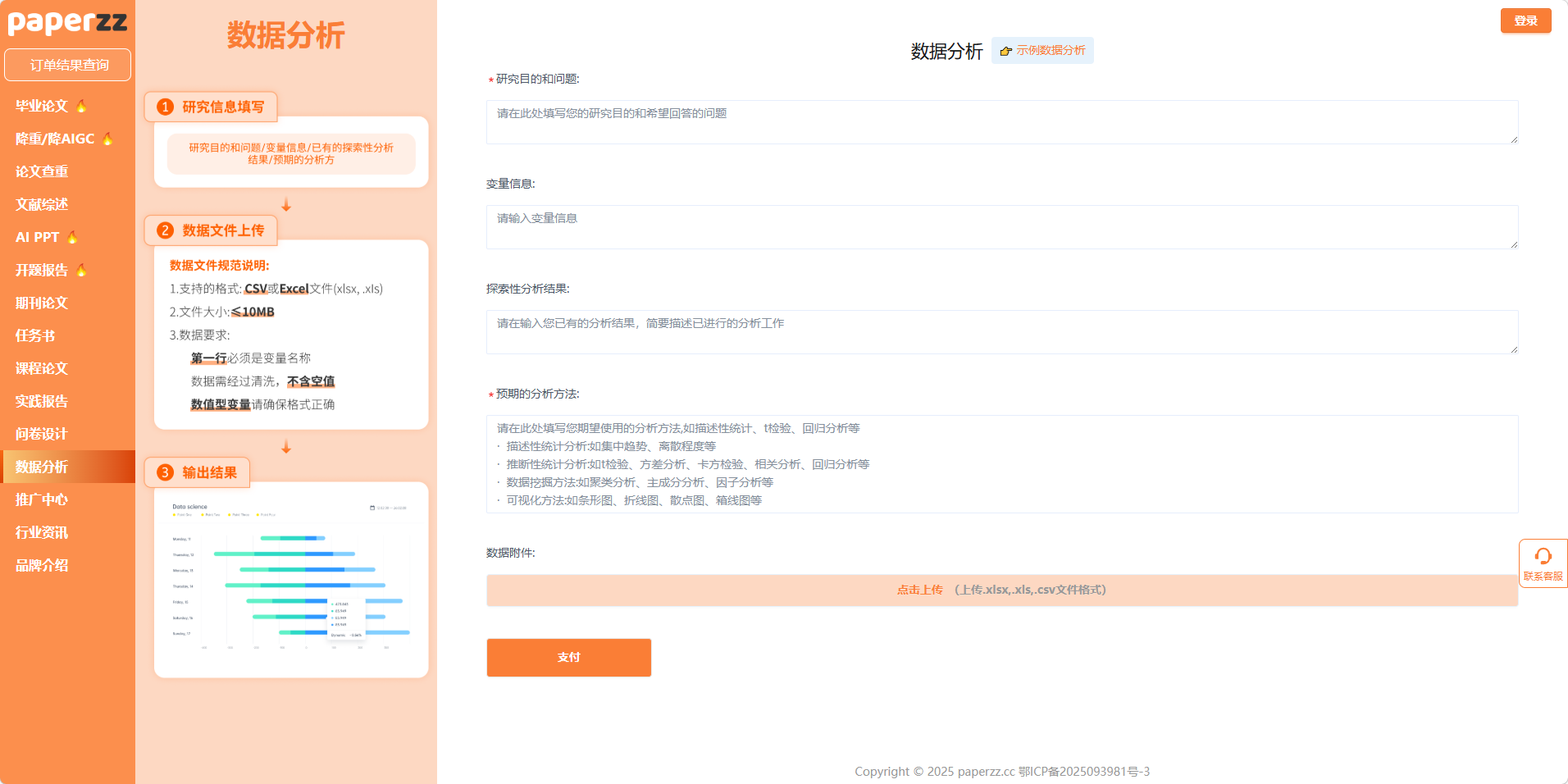 此外,Paperzz 还非常注重用户体验的细节。比如,平台提供了 “示例数据分析” 功能,用户可以先查看示例,了解整个分析流程和输出结果的样式;客服入口醒目,遇到问题可以随时获得帮助。这些细节,都让 Paperzz 在用户心中建立了良好的口碑。