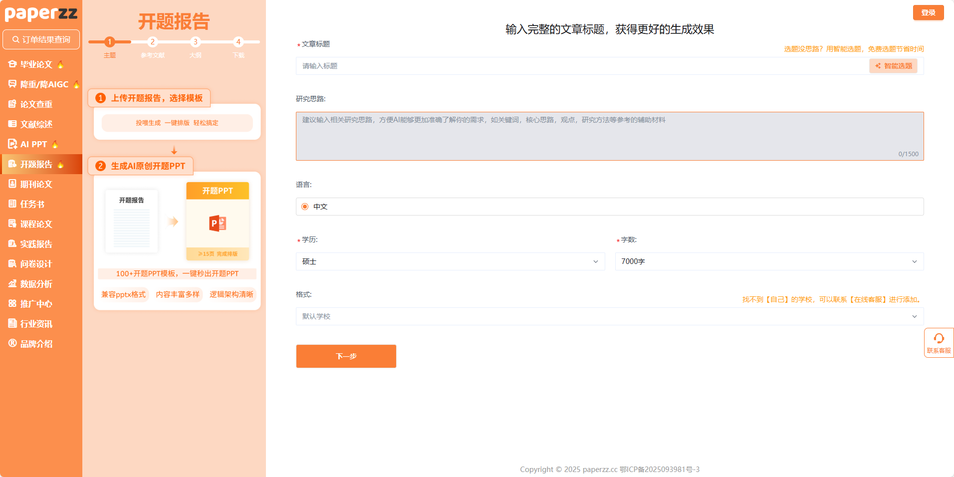对于研究生来说,“开题报告 + PPT” 是学术生涯的第一道 “关卡”—— 既要写 7000 字的报告逻辑,又要做 15 页以上的 PPT 框架,还要贴合学校格式要求,往往熬到凌晨还在改排版。而 Paperzz 的开题报告功能,直接把这个流程拆成了 “上传 / 填信息→生成成品” 两步,哪怕是第一次写开题的小白,也能顺着界面的引导快速出成果。