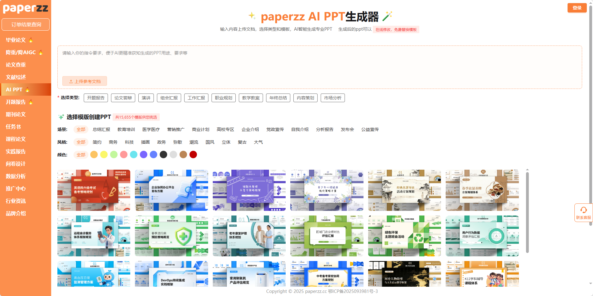 在这样的困境下,Paperzz AI PPT 生成器站了出来。它不只是一款普通的 PPT 工具,更是覆盖毕业论文答辩、开题报告、学术汇报等全场景的智能演示助手,从内容提炼到模板选择,从在线修改到免费换肤,用 AI 技术帮你把「熬夜做 PPT」变成「10 分钟高效交付」,让毕业答辩从容不迫。