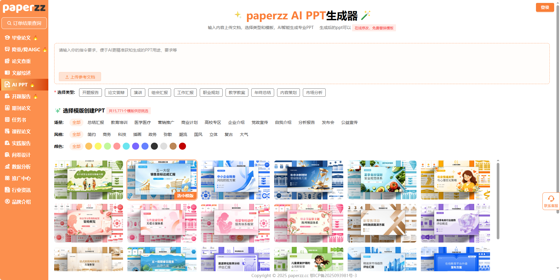 Paperzz AI PPT 生成器直接解决了这个问题。界面上明确标注了 “共 15,771 个模板供您挑选”,数量足够多,风格也足够全。而且它的模板不是杂乱无章地堆在一起,而是按照 “场景、风格、颜色” 做了细致的分类,你可以根据自己的需求快速筛选。