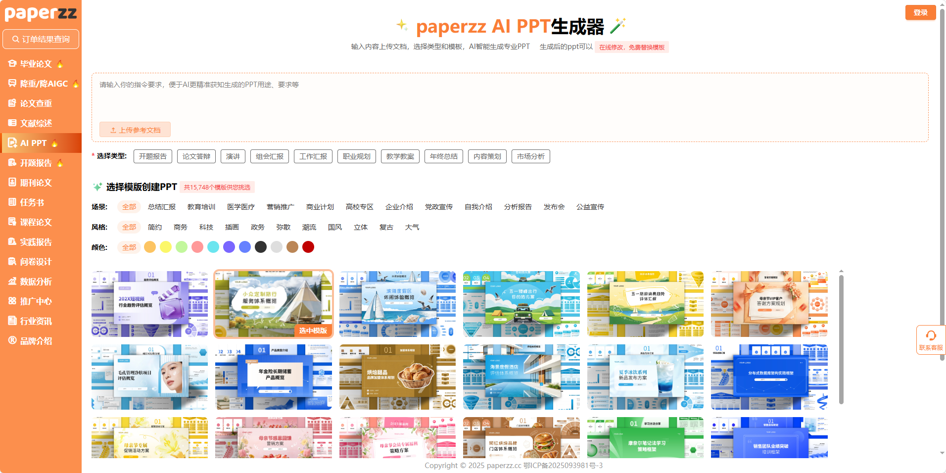答辩现场最尴尬的场景,莫过于和同学撞了同一款老旧模板,版式、配色一模一样,连导师都能一眼看出是批量套用的。paperzz 的 AI PPT 生成功能,直接用海量模板解决了这个痛点 —— 这里有超过 15748 个模板供你选择,覆盖学术、商务、教学等全场景,完全不用再去网上找盗版、低清的模板。