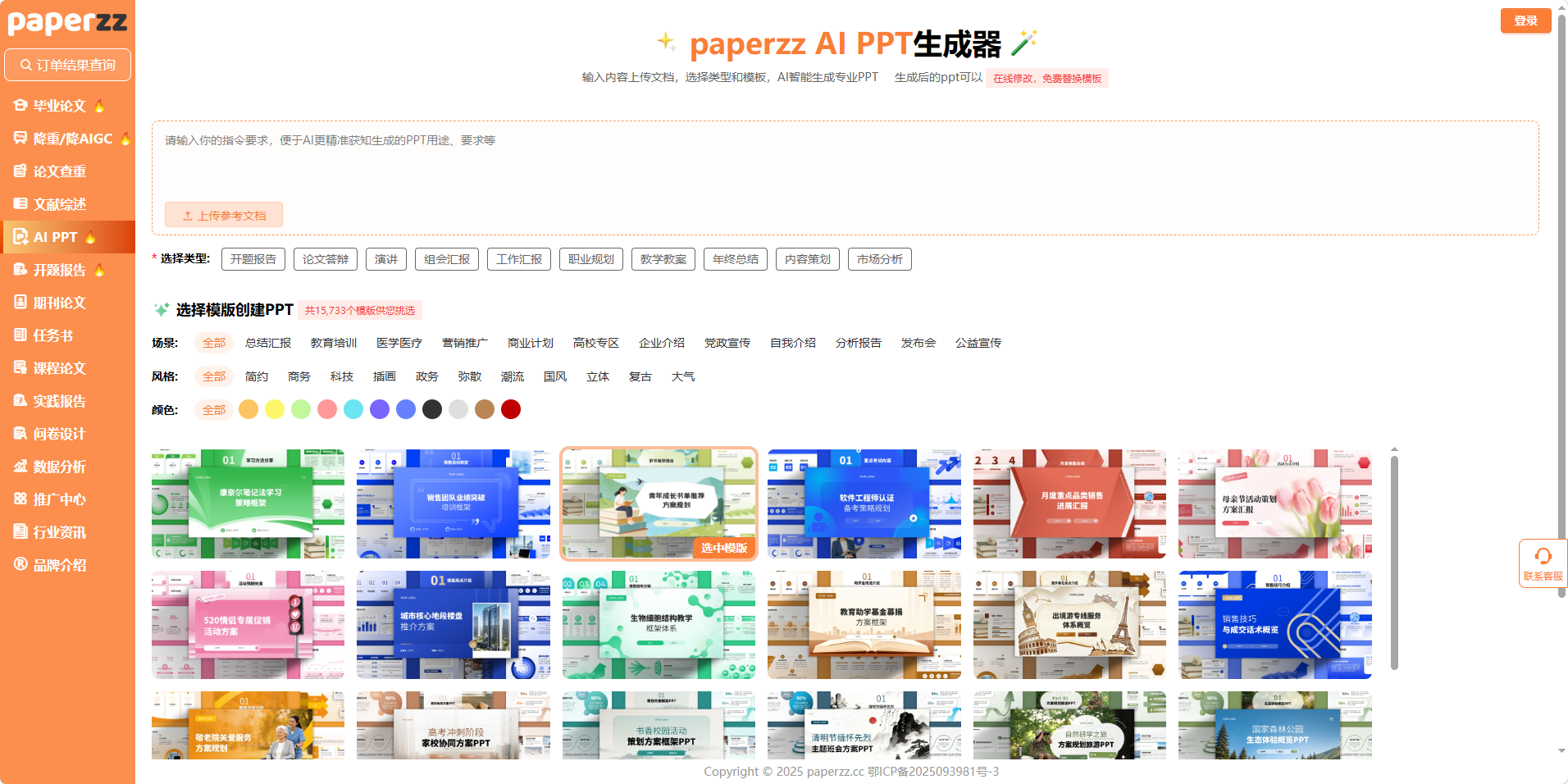 Paperzz AI PPT 生成器最核心的优势之一,是拥有15675 + 套专业模板,覆盖多场景、多风格、多配色,毕业生可根据答辩需求精准筛选: