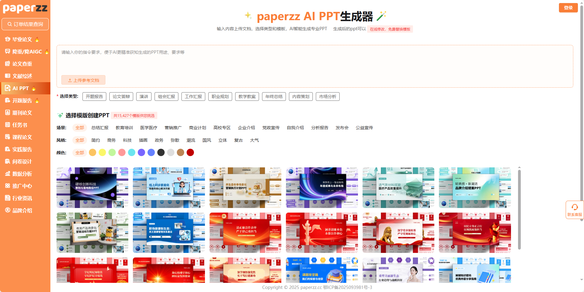 做 PPT 最纠结的,是 “模板和场景不搭”—— 比如学术答辩用了太花哨的模板,工作汇报选了太卡通的风格。paperzz AIPPT 直接解决这个问题:它有 15427 个模板,还按场景、风格、颜色做了精准分类。