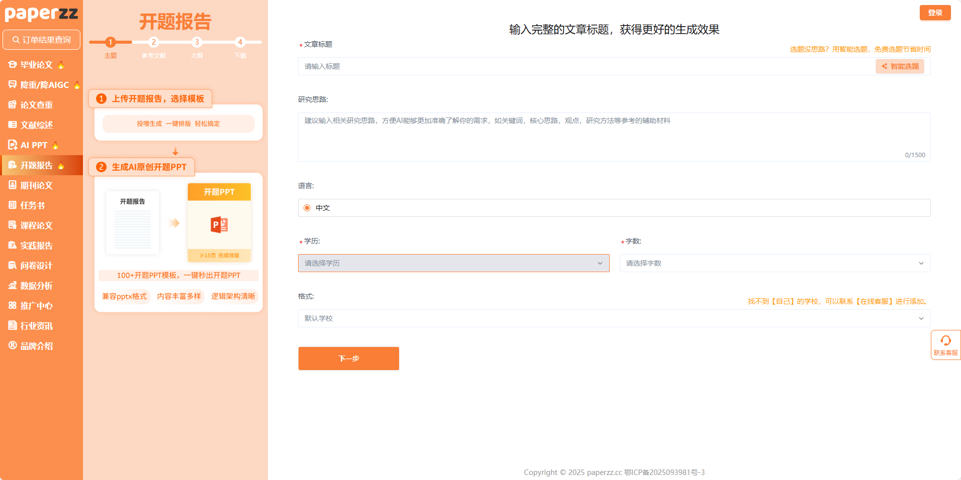 打开 Paperzz 界面,左侧导航栏里的 “开题报告” 按钮,像给毕业季开了个 “作弊码”—— 但它的核心,是用工具理性替代 “盲目试错”。